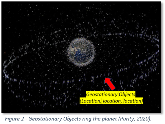 Theoretically, this allows for 1,800 such orbits. Approximately just over 400 are currently in use today as in Figure 2 (Howell, 2015). However, not all orbits are created equal as some might be positioned over remote areas with limited population centers. Also, getting a payload into position is expensive. Such launches require three stage rockets with significant propellent to reach high altitude. The communications applications and costs place a premium on these orbital assignments.