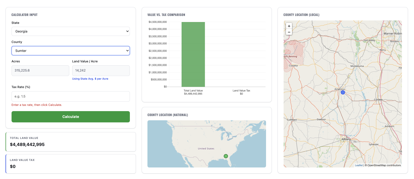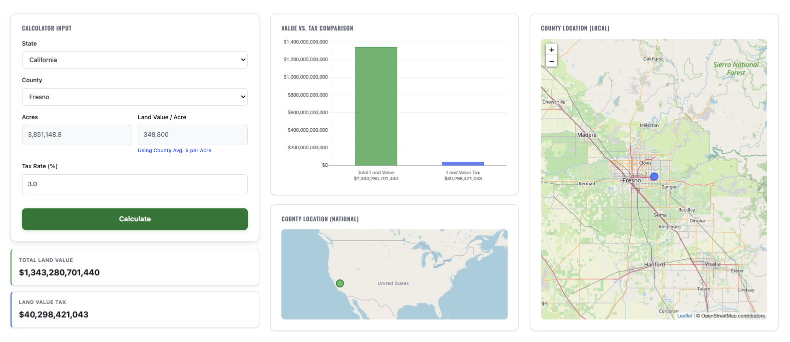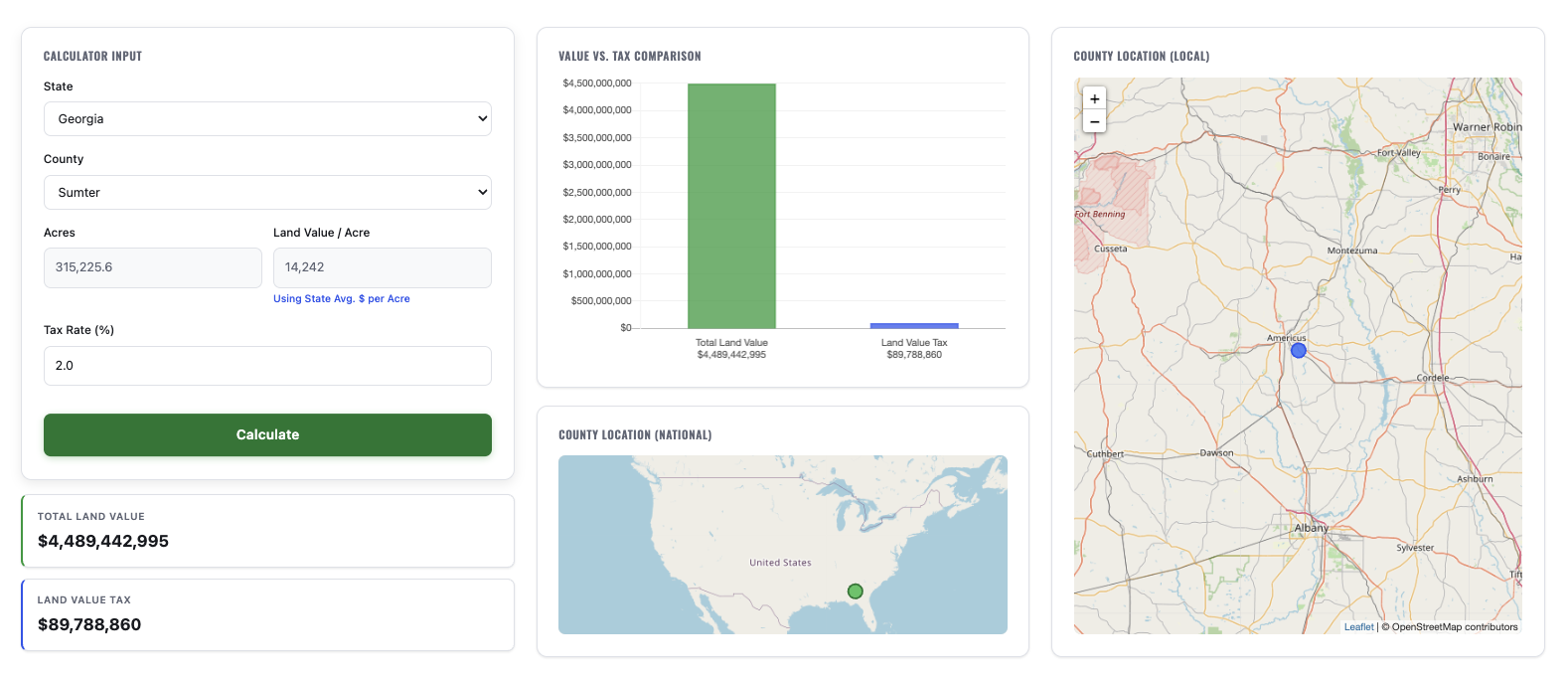 The Land Value calculator was first released in 2020 by the Henry George School of Science. The tool allows users to calculate the Land Value tax rates of over 3,000 counties in the US. This simple tool enables users to put theory into practice for various applications. To keep the calculator as accurate as possible, we occasionally update and refresh the underlying data.