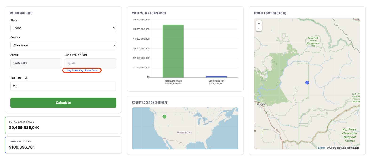 Updated Sources: The LVT Calculator has been updated to include new data sources. The data sources used in the new version are Larson (2022) and Larson (2019) from the FHFA, as well as a State average from Morris (2022). The default county land value is now the State average for all counties from Morris (2022), while all updated counties will draw from Larson (2022). For counties that have not been updated, but have specific land values, the calculator will draw on Larson (2019). These changes have been made to ensure more accurate tax computation in the LVT Calculator.